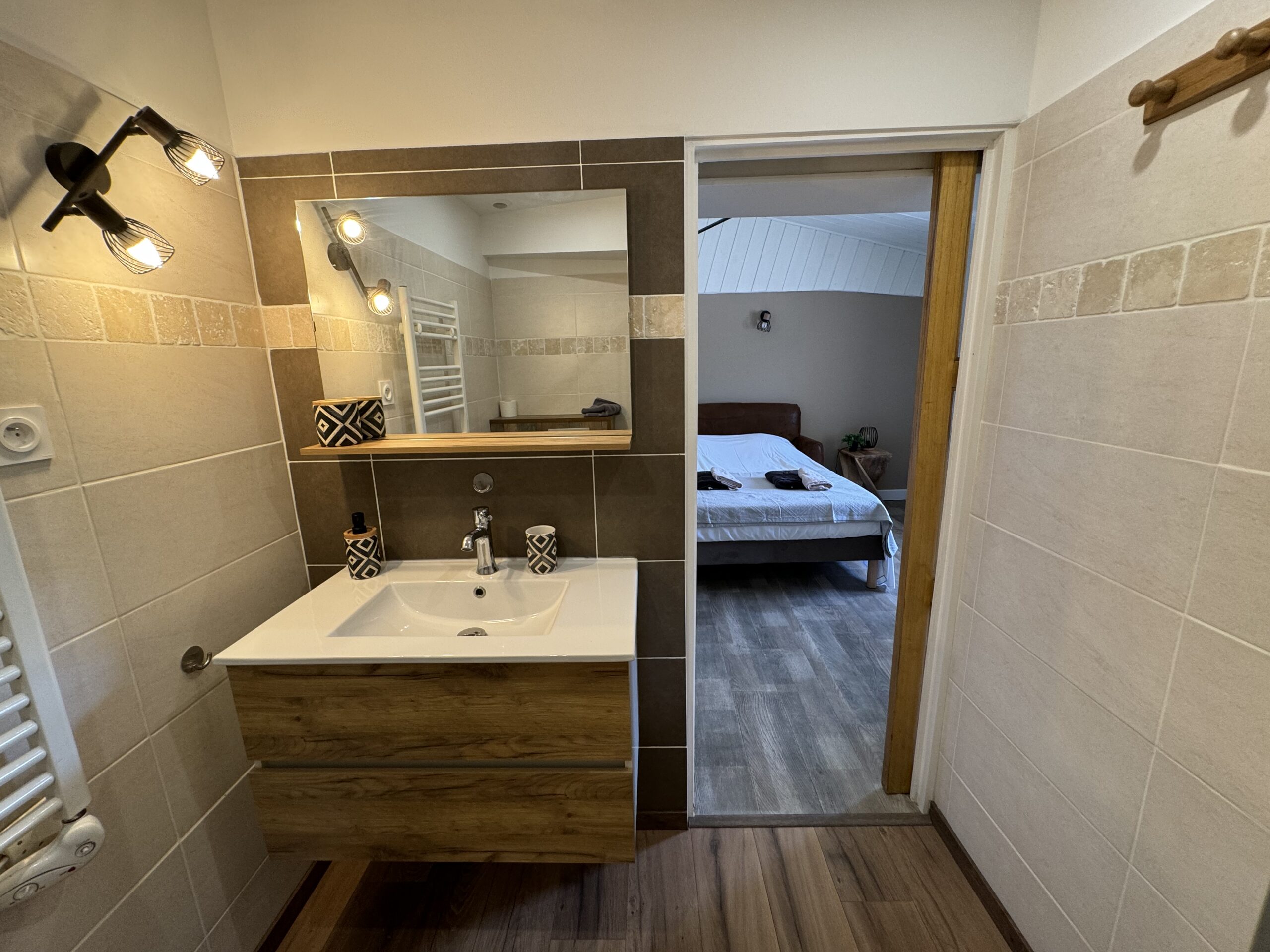 La chambre avec un lit en 140cm à l’étage et un lit de 90cm, au rez de chaussée un petit salon avec un canapé convertible, une salle de bain et une terrasse extérieure où vous pourrez apprécier le calme et la nature, vous pourrez également y déguster une boisson rafraichissante après une belle randonnée.